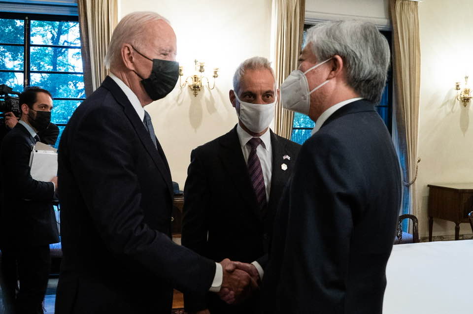 Photo 2: President Joe Biden greets Glen S. Fukushima in May 2022 (Pacific Citizen).